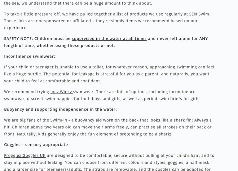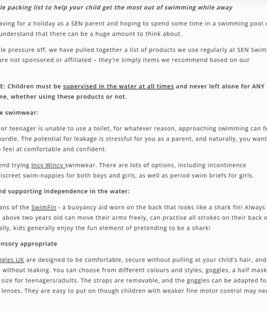 Specialist swim school SEN Swim needed a couple of blogs to add depth to their site. We discussed a number of topics and settled on several topics that were timely to the season (what to take on holiday and what to expect from the lessons) and most pertinent to the audience - parents of children with special educational needs and/or disabilities.